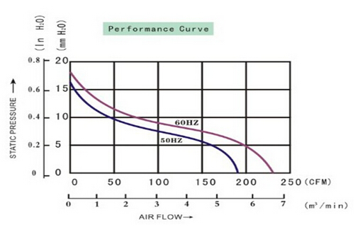 | वी | हर्ट्ज | ए | डब्ल्यू | आरपीएम | एम 3 / मिनट | CFM | mmH2O | डीबी (ए) | ||